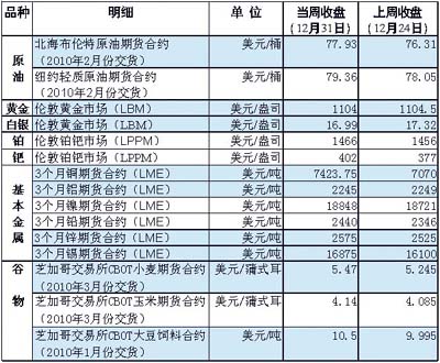 2009年最后一周,國際大宗商品價格多數(shù)上漲。 由于寒冷天氣拉動燃油消費,加之美國原油庫存已連續(xù)四周下降,餾分油庫存連續(xù)三周下降,推動當周原油價格連續(xù)四個交易日上漲。此外,受美國首次申請失業(yè)救濟人數(shù)下滑等因素影響,紐約市場油價一度漲至每桶80美元。與2008年年終收盤相比,國際油價2009年的漲幅超過70%,為過去10年中漲幅最大的一年。世界經(jīng)濟復蘇狀況及國際貨幣匯率的變化是引發(fā)油價波動的主要因素。 市場預期,隨著世界經(jīng)濟進一步回升,能源市場的供求狀況將隨之改變,國際油價也將在2010年繼續(xù)走強。 當周國際金價震蕩收平,受美元指數(shù)波動影響,四個交易日里漲跌各半,收盤價仍維持在每盎司1100美元附近。 受智利銅礦工人罷工事件影響,倫敦金屬交易所(LME)3個月期銅價格在2009年最后一周升至15個月來高點。全球基本金屬價格2009年普遍上漲,其中銅價漲勢最為迅猛。LME期銅價格從2008年12月的每噸2825美元一路飆升至2009年年底的每噸7400美元上方,全年漲幅超過160%。 由于LME超過46萬噸的鋁庫存仍處于歷史高位,對鋁價起到抑制作用,使當周鋁價小幅下跌。在宏觀經(jīng)濟數(shù)據(jù)改善的大背景下,德國財長施泰因布呂克日前呼吁二十國集團成員協(xié)調(diào)經(jīng)濟刺激計劃的退出機制,市場擔心這會對金屬需求的前景產(chǎn)生影響。