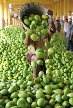 一名工人在印度海德拉巴附近的一個(gè)水果市場(chǎng)倒芒果。印度盛產(chǎn)芒果,這里每年出產(chǎn)的芒果接近世界總產(chǎn)量的一半。新華社/法新 |