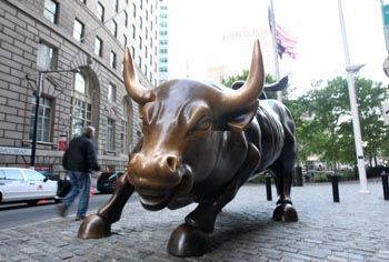 在美國(guó)紐約拍攝的華爾街銅牛。新華社記者 劉欣