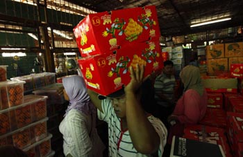 在印度尼西亞首都雅加達的一個水果市場,一名工人扛著兩箱中國產的桔子。路透社 |