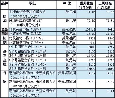 由于市場對中國有可能收緊貨幣政策的持續(xù)擔憂以及對世界宏觀經(jīng)濟的謹慎展望,當周多數(shù)大宗商品延續(xù)前一周跌勢。 國際油價當周繼續(xù)下跌,主要受美元走強等因素影響,美元對歐元匯率創(chuàng)6個月來新高。美國商務(wù)部1月29日發(fā)布報告說,2009年第4季度美國經(jīng)濟增長5.7%,連續(xù)第2個季度增長。該數(shù)據(jù)強化了市場有關(guān)美國經(jīng)濟將比其他發(fā)達國家更快復(fù)蘇的觀點,致使美元走強、油價下跌。另外,投資者對原油需求前景仍然存在疑慮,也對油價形成打壓。英國石油公司首席執(zhí)行官托尼·海沃德1月28日在達沃斯預(yù)測,今年石油價格將維持在每桶60美元至80美元之間。 當周美元走強和市場對稀有金屬價格繼續(xù)回落,國際金價已跌破每盎司1100美元。有報道援引興業(yè)銀行研究處資深黃金分析師蔣舒博士的話說,進入新年以來,全球經(jīng)濟形勢仍不明朗,一些主要經(jīng)濟體尤其是美國公布的重要經(jīng)濟數(shù)據(jù)直接影響了金價走勢。除鎳價有所上升之外,倫敦金屬交易市場其他基本金屬3個月期貨價格當周都在下跌,其中銅價降幅最大。 在觸及3個多月來低點后,芝加哥期貨交易所(CBOT)農(nóng)產(chǎn)品期貨28日小幅反彈。南美作物產(chǎn)量巨大繼續(xù)為市場帶來壓力。