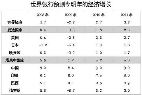 世界銀行報(bào)告認(rèn)為,隨著一系列經(jīng)濟(jì)刺激措施的實(shí)施,“危機(jī)最尖銳的階段已經(jīng)過去,世界經(jīng)濟(jì)正在復(fù)蘇進(jìn)程中”,此前的信貸市場(chǎng)凍結(jié)、資本流動(dòng)全面倒轉(zhuǎn)的極端情況已不復(fù)存在。 報(bào)告指出,從2009年3月份至今,各國股市已基本收復(fù)了一半的失地,經(jīng)濟(jì)復(fù)蘇首先在新興經(jīng)濟(jì)體開始,現(xiàn)在已全面擴(kuò)展至發(fā)達(dá)經(jīng)濟(jì)體。 按照世界銀行的這份最新報(bào)告,全球GDP在2009年下降2.2%,預(yù)計(jì)今年將增長2.7%,2011年將增長3.2%。發(fā)展中國家有望走向相對(duì)強(qiáng)勁復(fù)蘇,今年預(yù)計(jì)增長5.2%,2011年預(yù)計(jì)增長5.8%,均高于2009年的1.2%。 其中,中國經(jīng)濟(jì)2009年增長8.4%,明后兩年則可望保持9%的高速增長。這在世界各國中首屈一指,也高于印度今明兩年7.5%和8.0%的增幅。 發(fā)達(dá)國家在2009年GDP下降3.3%,復(fù)蘇走勢(shì)也相對(duì)緩慢,2010年和2011年的增長預(yù)測(cè)分別為1.8%和2.3%。其中,美國經(jīng)濟(jì)2009年下降2.5%,今明兩年則可望分別增長2.5%和2.7%。日本經(jīng)濟(jì)今年下滑5.4%,今明兩年增幅則只有1.3%和1.8%。 世界貿(mào)易量2009年大幅下降,降幅高達(dá)14.4%,但今年和2011年預(yù)計(jì)分別增長4.3%和6.2%。 在油價(jià)方面,今年油價(jià)將維持在每桶76美元,其他大宗商品價(jià)格今明兩年也不大可能出現(xiàn)飚升,預(yù)計(jì)升幅在3%左右。