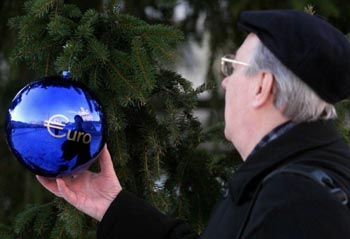 一名老人饒有興味地欣賞一只印有歐元符號的圣誕樹掛飾。新華社發(fā)(資料照片)