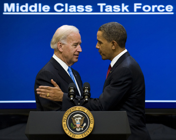 1月25日,美國總統(tǒng)奧巴馬(右)和副總統(tǒng)拜登在白宮出席中產(chǎn)階級家庭工作組會議。新華社/法新 |