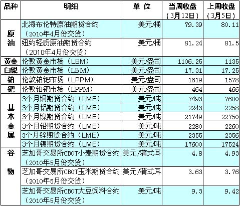 國(guó)際油價(jià)在當(dāng)周大宗商品價(jià)格變化中最為引人注目,11日震蕩上升越過(guò)82美元/桶后于12日小幅回落。11日收盤(pán)時(shí),紐約商品交易所4月份交貨的輕質(zhì)原油期貨價(jià)格上漲2美分,收于每桶82.11美元,連續(xù)第二天突破82美元,當(dāng)日倫敦市場(chǎng)北海布倫特原油期貨價(jià)格下跌20美分,收于每桶80.28美元。 分析人士指出,國(guó)際油價(jià)當(dāng)周的上升主要是受到投資者對(duì)需求的擔(dān)憂、美元走勢(shì)以及全球經(jīng)濟(jì)復(fù)蘇的預(yù)期等因素的影響。中國(guó)2月強(qiáng)勁的出口經(jīng)濟(jì)數(shù)據(jù)對(duì)市場(chǎng)也起了推升作用。 12日油價(jià)小幅回落主要受到美國(guó)消費(fèi)者信心指數(shù)和國(guó)際能源機(jī)構(gòu)對(duì)國(guó)際原油消費(fèi)預(yù)期的影響,密歇根大學(xué)與路透社公布的報(bào)告顯示,美國(guó)消費(fèi)者信心指數(shù)從2月份的73.6降至3月份的72.5。國(guó)際能源機(jī)構(gòu)調(diào)高了對(duì)今年國(guó)際原油需求的預(yù)期。該組織預(yù)計(jì),今年世界原油日消費(fèi)量有望增加7萬(wàn)桶,達(dá)到8657萬(wàn)桶。 國(guó)際金價(jià)8日自高點(diǎn)下滑。歐元兌美元走跌、2月份美國(guó)商品零售額意外增長(zhǎng)和投資者對(duì)希臘債務(wù)危機(jī)憂慮減緩等因素對(duì)金價(jià)走低起到了推動(dòng)作用。當(dāng)周貴金屬中,鈀價(jià)變化最為顯著,摸至近2年來(lái)的新高點(diǎn),達(dá)到480美元/盎司。鈀價(jià)飆升主要是因中國(guó)汽車銷售數(shù)據(jù)表現(xiàn)強(qiáng)勁。 受市場(chǎng)擔(dān)憂中國(guó)對(duì)銅需求下降以及龐大市場(chǎng)庫(kù)存影響,當(dāng)周國(guó)際銅價(jià)下降,而此前一周,由于美國(guó)就業(yè)數(shù)據(jù)好于預(yù)期及世界最大產(chǎn)銅國(guó)——智利遭受地震,銅價(jià)一度攀升。 當(dāng)周大豆價(jià)格面臨走低的壓力,由于出口銷售大幅下降,11日芝加哥期貨交易所(CBOT)大豆期貨遭遇重挫,5月合約下跌27.5美分,以每蒲式耳9.305美元收盤(pán),盤(pán)中一度跌至9.29美元的4周低點(diǎn)。中國(guó)取消大量美國(guó)大豆進(jìn)口訂單以及南美大豆的豐產(chǎn)預(yù)期都為市場(chǎng)帶來(lái)壓力。10日,美國(guó)農(nóng)業(yè)部將巴西大豆產(chǎn)量由上月的6600萬(wàn)噸上調(diào)至6700萬(wàn)噸后,阿根廷布宜諾斯艾利斯谷物交易所當(dāng)天也將該國(guó)今年大豆產(chǎn)量由5200萬(wàn)噸上調(diào)至5350萬(wàn)噸。