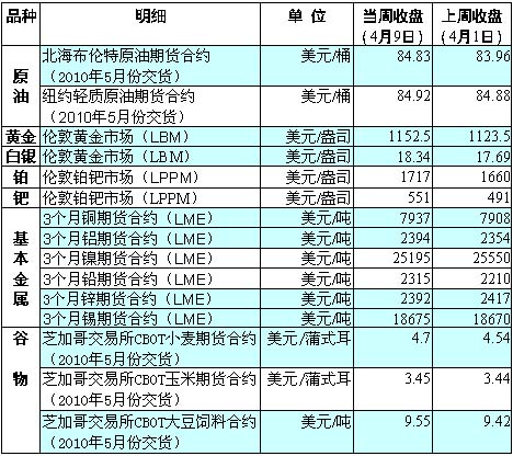 倫敦市場基本金屬價(jià)格多數(shù)上揚(yáng),其中銅期貨價(jià)當(dāng)周一度升至每噸8010美元,為2008年8月初以來最高。分析人士指出,發(fā)達(dá)國家的采購經(jīng)理人指數(shù)今年以來延續(xù)擴(kuò)張之勢。此外,全球交易所基本金屬庫存近期由持續(xù)增長轉(zhuǎn)為高位回落,這成為金屬價(jià)格短期快速上漲的又一支撐。 國際油價(jià)當(dāng)周先揚(yáng)后抑。受投資者對經(jīng)濟(jì)復(fù)蘇和能源需求前景樂觀預(yù)期的推動,國際油價(jià)在當(dāng)周前兩個(gè)交易日接連上漲。其中,紐約市場油價(jià)6日盤中一度漲至每桶87.09美元,這是自2008年10月初以來油價(jià)首度突破87美元關(guān)口。此后,在美元走強(qiáng)、美國原油商業(yè)庫存連續(xù)第十周增加和獲利回吐等因素的共同作用下,國際油價(jià)連續(xù)三天出現(xiàn)下滑,紐約市場油價(jià)9日跌至每桶85美元之下。 倫敦市場金價(jià)9日觸及每盎司1160.03美元的高位,為今年1月11日以來最高。分析人士指出,實(shí)物需求、通脹壓力及主權(quán)債務(wù)問題等因素正推動金價(jià)上漲。目前,國際金價(jià)離年內(nèi)高點(diǎn)1164美元只有一步之遙,且在整個(gè)基本面支持下,金價(jià)易漲難跌。不過,獲利回吐和美元走強(qiáng),短期內(nèi)可能限制金價(jià)上行空間。 芝加哥小麥期貨價(jià)當(dāng)周呈波幅震蕩走勢。分析人士稱,全球小麥巨大的供應(yīng)量以及美國產(chǎn)糧區(qū)未來數(shù)日的良好天氣將繼續(xù)打壓小麥價(jià)格走低。美國大部分玉米種植地區(qū)溫暖干燥的天氣將持續(xù)到下周。