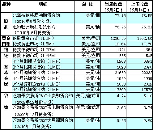 盡管上周初歐盟成員國財長推出了高達7500億歐元的龐大救助機制,防止希臘債務(wù)危機進一步蔓延,但市場投資者仍擔心西班牙、葡萄牙等國將步希臘后塵,最終拖累全球經(jīng)濟復(fù)蘇步伐。避險情緒推動全球資金轉(zhuǎn)投黃金市場,當周國際金價因此再度走高。 號稱史上規(guī)模最大的救助機制并未成功消除市場對歐元區(qū)債務(wù)危機再度升級的擔憂。市場目前將更多注意力集中在幾個債務(wù)嚴重的國家身上:西班牙、葡萄牙兩國政府相繼宣布采取緊縮的財政政策以抑制財政赤字,希臘國內(nèi)罷工仍在繼續(xù),歐元區(qū)未來將面臨分裂的可能性正在加大,此類負面消息令投資者感到沮喪。市場分析人士認為,只要歐元區(qū)債務(wù)危機無法解除警報,作為“避險天堂”的黃金就會繼續(xù)受到追捧,目前來看,今年二季度國際金價攀上1300美元/盎司已無阻力可言。在金價提振之下,銀價當周走高,升至近兩年來高點。 受市場擔心歐元區(qū)債務(wù)危機蔓延,美元匯率繼續(xù)走向以及美國商業(yè)原油庫存增加等因素影響,國際油價當周下跌。美國能源部13日公布的數(shù)據(jù)顯示,此前一周美國原油商業(yè)庫存增加了190萬桶,比此前市場分析師預(yù)期值高出一倍以上。此外,總部位于巴黎的國際能源機構(gòu)也削減了其對全球能源需求的預(yù)估數(shù)據(jù)。國際能源機構(gòu)預(yù)測,今年全球原油需求為每日8640萬桶,將比去年高出1.9%,但這一數(shù)字比該組織上次公布的預(yù)測值要低22萬桶/日。國際能源機構(gòu)認為,在主權(quán)債務(wù)危機的影響下,全球經(jīng)濟復(fù)蘇正面臨著日益增加的風(fēng)險,這將對全球能源需求產(chǎn)生抑制作用。截至周五(14日),紐約市場上6月份交貨的輕質(zhì)原油期貨價格降至每桶73.25美元,倫敦市場上6月份交貨的北海布倫特原油期價以每桶77.75美元報收。 此外,當周倫敦金屬市場上,基本金屬價格跌多漲少,比較顯著的是,3個月的銅期價漲至每噸6908美元。 芝加哥交易所中,主要農(nóng)產(chǎn)品期貨價格當周下挫。一方面,歐元匯率下跌提升了歐洲農(nóng)產(chǎn)品在國際市場中的競爭優(yōu)勢,對美國小麥出口不利;另一方面,近期美國主要糧食產(chǎn)區(qū)氣候條件適宜農(nóng)產(chǎn)品生長,豐收預(yù)期得到強化,因此對農(nóng)產(chǎn)品期貨價格構(gòu)成一定壓力。