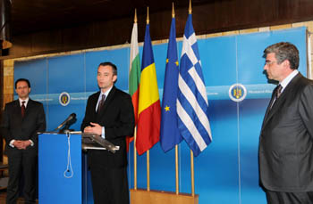 5月21日,羅馬尼亞外長(zhǎng)巴孔斯基(右)、希臘代外長(zhǎng)茲魯察斯(中)和保加利亞外長(zhǎng)姆拉德諾夫在羅馬尼亞首都布加勒斯特出席記者招待會(huì)。當(dāng)天,三國(guó)外長(zhǎng)在布加勒斯特舉行會(huì)晤,主要討論共同應(yīng)對(duì)當(dāng)前經(jīng)濟(jì)危機(jī)、加強(qiáng)地區(qū)各領(lǐng)域合作等問(wèn)題。新華社記者