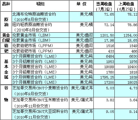 當(dāng)周?chē)?guó)際油價(jià)接連下挫,影響因素主要包括:颶風(fēng)對(duì)產(chǎn)油區(qū)威脅減弱、投資者對(duì)世界經(jīng)濟(jì)復(fù)蘇前景擔(dān)憂(yōu)和美元走強(qiáng)等。市場(chǎng)人士預(yù)測(cè),近期國(guó)際油價(jià)難以擺脫區(qū)間震蕩的走勢(shì),總體維持在70美元至85美元/桶的可能性較大。 美國(guó)國(guó)家颶風(fēng)中心的最新報(bào)告稱(chēng),位于加勒比海地區(qū)的熱帶風(fēng)暴可能會(huì)繞過(guò)主要產(chǎn)油區(qū),因此減輕了投資者的憂(yōu)慮,致使油價(jià)從高位回落。此外,還有一系列的經(jīng)濟(jì)報(bào)告讓投資者對(duì)于世界能源消費(fèi)需要前景看淡,導(dǎo)致油價(jià)下跌。例如,美國(guó)世界大型企業(yè)委員會(huì)6月29日公布的美國(guó)6月份消費(fèi)信心指數(shù)大幅下滑,結(jié)束了連續(xù)三個(gè)月的上升。7月1日美國(guó)勞工部的報(bào)告顯示,上周首次申請(qǐng)失業(yè)救濟(jì)的人數(shù)增加了1.3萬(wàn)人,而經(jīng)濟(jì)學(xué)家此前預(yù)計(jì)這一數(shù)據(jù)會(huì)小幅下降。 繼前一周創(chuàng)下歷史新高后,倫敦市場(chǎng)黃金期貨價(jià)略有下跌。 因中美公布的疲軟經(jīng)濟(jì)數(shù)據(jù)加劇全球經(jīng)濟(jì)增長(zhǎng)憂(yōu)慮,當(dāng)周倫敦市場(chǎng)基本金屬期貨價(jià)格全線(xiàn)走低。 當(dāng)周,芝加哥期貨交易所谷物期貨價(jià)波動(dòng)明顯。受利空的外部市場(chǎng)以及理想天氣條件的打壓,6月29日玉米期價(jià)連續(xù)第七個(gè)交易日下跌,小麥期價(jià)連續(xù)第三個(gè)交易日下跌,大豆期價(jià)也止?jié)q轉(zhuǎn)跌。之后,在美國(guó)農(nóng)業(yè)部利好報(bào)告的有力提振下,玉米期價(jià)6月30日創(chuàng)下9個(gè)月以來(lái)最大漲幅,小麥期價(jià)創(chuàng)下8個(gè)月以來(lái)的最大漲幅。美國(guó)農(nóng)業(yè)部的利好報(bào)告在7月1日繼續(xù)帶動(dòng)玉米、小麥的價(jià)格走高。但由于玉米期貨在這兩個(gè)交易日中累計(jì)漲幅超過(guò)了12%,而且考慮到美國(guó)國(guó)慶假日即將來(lái)臨,交易商為規(guī)避不確定性風(fēng)險(xiǎn),最終在7月2日選擇獲利回吐打壓玉米走勢(shì)。