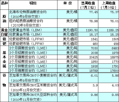 受到美國上市公司良好業(yè)績、美元走低以及熱帶風(fēng)暴可能襲擊墨西哥灣等因素刺激,紐約市場油價(jià)再次逼近每桶80美元關(guān)口。倫敦市場金價(jià)也回升至每盎司1200美元附近。 卡特彼勒、聯(lián)合包裹公司以及美國電話電報(bào)公司等一系列美國大公司相繼公布的二季度業(yè)績均好于預(yù)期,多數(shù)公司還調(diào)高了對全年的盈利預(yù)期,這增強(qiáng)了市場投資者的信心。 同時(shí),歐洲公布的經(jīng)濟(jì)數(shù)據(jù)顯示歐元區(qū)經(jīng)濟(jì)增長情況好于預(yù)期,這促使歐元對美元匯率走強(qiáng)。上述樂觀經(jīng)濟(jì)數(shù)據(jù)均對大宗商品市場起到了明顯的支撐作用。 由于一些美國公司財(cái)報(bào)令投資者感到鼓舞,且歐洲和亞洲股市多數(shù)上漲,同時(shí)美元對主要西方貨幣出現(xiàn)了不同程度的下跌,倫敦市場基本金屬價(jià)格也全線上漲。當(dāng)周鉛期貨價(jià)上漲10%,錫期貨價(jià)上漲6.7%,鎳和鋅期貨價(jià)均上漲7.5%。 芝加哥農(nóng)產(chǎn)品期價(jià)漲跌不一。受到天氣因素和外部市場的影響,芝加哥期貨交易所玉米期價(jià)跌勢明顯。盡管目前美國中西部天氣炎熱,但近期大量降雨緩解了高溫天氣給玉米作物帶來的影響,提振其豐產(chǎn)預(yù)期。 在投資者關(guān)于炎熱干燥天氣將進(jìn)一步降低歐洲、俄羅斯、哈薩克斯坦、加拿大等全球小麥主產(chǎn)區(qū)小麥產(chǎn)量的預(yù)期推動下,小麥期價(jià)進(jìn)一步走高。7月份以來,芝加哥小麥期價(jià)已大幅攀升24%,并于22日觸及每盎司6.1美元的2009年6月以來的高點(diǎn)。 美國農(nóng)業(yè)部23日公布的數(shù)據(jù)顯示,美國私人出口商向中國售出將于2010至2011市場年交割的17.55萬噸大豆,而上周大豆凈出口銷售量遠(yuǎn)遠(yuǎn)高于預(yù)期,顯示出美國大豆出口銷售步伐十分強(qiáng)勁。此外,天氣預(yù)報(bào)顯示,自周末起一股炎熱氣流將橫掃美國中西部大豆種植帶的大部分地區(qū)。由于目前美國大豆已經(jīng)進(jìn)入生長的關(guān)鍵時(shí)期,天氣因素的不確定性助推大豆期價(jià)上揚(yáng)。