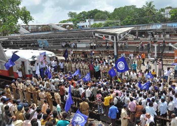 印度全國(guó)罷工抗議油價(jià)上漲。7月5日,示威者在印度孟買(mǎi)一處火車(chē)站舉行抗議。新華社/路透 |