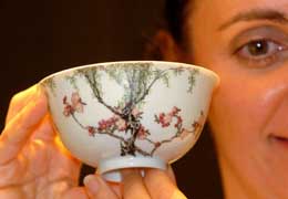 清乾隆御制琺瑯彩杏林春燕圖碗,估價逾6000萬港元。 本報記者 黃本強 攝