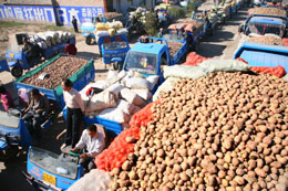| 出售馬鈴薯的車隊(duì)排成長龍。本報(bào)記者