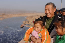 12月9日,在“引黃濟淀”黃河水入淀現(xiàn)場,任丘市大樹留莊村民李玉山帶著孫女觀看黃河水入淀。 當日,隨著河北任丘的十二孔閘開閘,奔波近400公里的黃河水終于流入白洋淀。 據(jù)了解,此次“引黃濟淀”是黃河首次向白洋淀實施生態(tài)輸水。11月24日,黃河水從山東聊城位山引黃閘調(diào)出,12月5日到達河北任丘任文干渠。經(jīng)過四天的污水導流和蓄水,黃河水成功入淀。調(diào)水后,白洋淀水位將上升到7.45米,水面增加三倍。