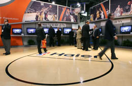 在海爾300多平方米的展位上,數(shù)臺(tái)超大屏幕高清電視上播放的NBA比賽畫(huà)面,動(dòng)感十足,吸引了許多人的目光。等候海爾展區(qū)NBA巨星德雷克斯勒簽名的人排起了長(zhǎng)隊(duì)。