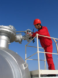 工人正在西氣東輸主力氣 源地中央處理廠檢查閥門 |