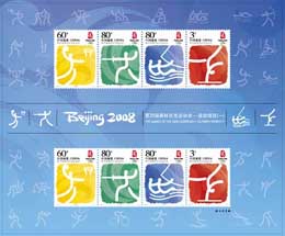 目前已經(jīng)有“會徽”與“吉祥物”小版張、“會徽與吉祥物”不干膠小版張、“奧運(yùn)項(xiàng)目”不干膠小版張等郵品上市!皶铡迸c“吉祥物”小版張、“會徽與吉祥物”不干膠小版張2005年11月12日發(fā)行,自上市以來就在市場中扮演了無可比擬的角色。