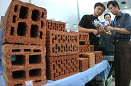 南京一家新型建筑材料公司在展示該公司利用頁巖和尾礦等礦山廢棄物開發(fā)研制的各種節(jié)能墻磚。(本報資料照片) |