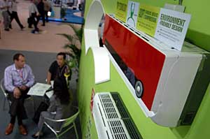 4月19日,客商在廣交會(huì)出口展館一家中國(guó)家電企業(yè)的綠色環(huán)?照{(diào)展臺(tái)洽談。在4月15日開(kāi)幕的第101屆廣交會(huì)上,中國(guó)家電企業(yè)推出一批綠色節(jié)能環(huán)保型家電產(chǎn)品,積極應(yīng)對(duì)歐盟頒布的第三代綠色壁壘——“耗能產(chǎn)品環(huán)保設(shè)計(jì)”指令。新華社記者