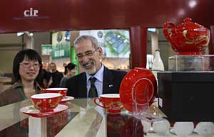 俄羅斯參觀者在觀看中國瓷器。本報(bào)記者 魯金博 攝