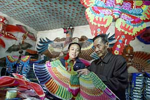 已過(guò)耳順之年的潘伯華說(shuō),自己扎制風(fēng)箏是自學(xué)成才。工作以后,因?yàn)轱L(fēng)箏扎得好,在市里的比賽中拿了不少獎(jiǎng),1993年前后就開(kāi)始專(zhuān)做風(fēng)箏生意了。經(jīng)過(guò)十幾年的發(fā)展,他的風(fēng)箏生意做得很紅火。潘伯華告訴我們,他的兒子已經(jīng)在法國(guó)定居,主要負(fù)責(zé)與國(guó)外的風(fēng)箏貿(mào)易,每個(gè)月都能發(fā)出一集裝箱的風(fēng)箏到世界各地!巴鈬(guó)人對(duì)中國(guó)的傳統(tǒng)風(fēng)箏非常著迷,認(rèn)為風(fēng)箏是極富有中國(guó)特色的工藝品。一個(gè)龍頭蜈蚣風(fēng)箏在法國(guó)的價(jià)格是國(guó)內(nèi)的十幾倍,甚至幾十倍!