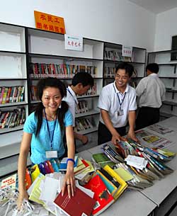 江西青春康源藥業(yè)有限公司的農(nóng)民工在閱覽室整理由新余市總工會(huì)捐贈(zèng)的新書籍。本報(bào)記者 宋振平 攝 |