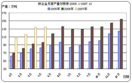 鐵合金相關(guān)產(chǎn)品出口關(guān)稅的提升與一組數(shù)據(jù)密切相關(guān)。統(tǒng)計(jì)數(shù)據(jù)顯示,今年前四個(gè)月,我國(guó)鐵合金生產(chǎn)總量達(dá)到493.4萬(wàn)噸,2006年同期為345.76萬(wàn)噸,同比增長(zhǎng)42.7%,遠(yuǎn)遠(yuǎn)高于2006年30.93%的增幅。商務(wù)部有關(guān)負(fù)責(zé)人在5月底舉辦的2007年中國(guó)鐵合金國(guó)際會(huì)議上表示,鐵合金應(yīng)保持適度出口,2007年鐵合金出口總量應(yīng)少于去年。否則,鐵合金出口關(guān)稅將再次調(diào)整。