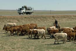 在我國(guó)西北地區(qū),公路的扶貧意義遠(yuǎn)遠(yuǎn)大于中東部地區(qū)。圖為在內(nèi)蒙古蘇尼特右旗境內(nèi)的一條公路旁,牛群在汽車的引領(lǐng)下走向新的牧場(chǎng)。(本報(bào)資料照片) | 由于地方財(cái)政普遍拮據(jù),資金壓力大、融資渠道單一成為西北交通建設(shè)的瓶頸和桎梏。自去年以來,國(guó)家開發(fā)銀行在西北嘗試銀團(tuán)貸款,這一模式的推廣,讓屢屢為融資而絞盡腦汁的西北交通建設(shè)部門感到欣喜不已。
