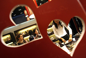 | 在北京的一家首飾店內(nèi),幾位女士正在挑選鉆石飾品。本報記者 李俊東