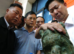 青銅器鑒定專家張定福(右一)認(rèn)真地為市民鑒定器物。 隨著民間收藏活動(dòng)的升溫,一批考古與鑒定領(lǐng)域的專家學(xué)者們,利用周末免費(fèi)為市民做文物鑒別與鑒定。 新華社記者:楊俊江