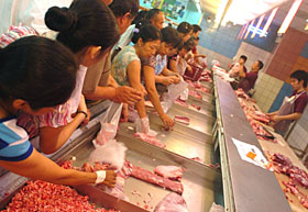 | 近日來,由于豬肉批發(fā)價上漲,重慶豬肉價格一路攀高,超市特價豬瘦肉賣到了每500克12.8元,眼下不單農(nóng)貿(mào)市場肉價漲聲一片,該市多數(shù)超市已上調(diào)豬肉售價。圖為不少市民正在一家超市肉柜前購買豬肉。