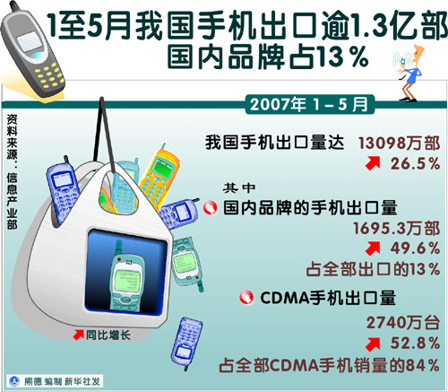 1至5月我國(guó)手機(jī)出口逾1.3億部國(guó)內(nèi)品牌占13%