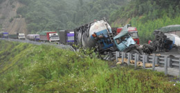 8月23日,重型水泥運(yùn)輸車輛連環(huán)相撞導(dǎo)致公路交通中斷。當(dāng)日凌晨三點(diǎn)多,在廣東英佛公路佛岡縣境內(nèi)路段,四輛重型水泥運(yùn)輸車相繼發(fā)生碰撞,部分車輛解體,導(dǎo)致水泥熟料大量泄漏。事故中有兩人當(dāng)場(chǎng)死亡。目前事故原因仍在調(diào)查中。 |