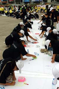 8月21日,哈爾濱青少年正在千米奧運長卷上繪畫。當日,“熱盼奧運會、情系大冬會”哈爾濱動漫青少年千米長卷繪畫活動在哈爾濱國際會展體育中心廣場舉行。