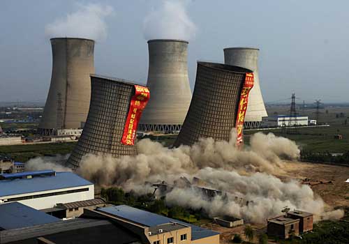 9月6日,河北邢臺翔泰熱電有限責(zé)任公司對總裝容量114MW的小火電部分設(shè)備成功進行爆破拆除,該公司的熱電機組已于7月23日全部關(guān)停。這是河北邢臺翔泰熱電有限責(zé)任公司爆破冷卻塔和動力通風(fēng)塔的場景(9月6日攝)。