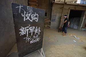 | 位于洞庭湖糧食主產(chǎn)區(qū)的益陽市赫山區(qū)蘭溪米市是全國十大米市之一,號稱“湖南米市晴雨表”。圖為掛出的早稻收購價牌子。 |