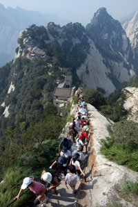 游客在攀登華山險道飛魚嶺登山通道。新華社發(fā) | 首屆中國體育旅游博覽會日前在上海閉幕。體育與旅游,都是熱門詞匯,兩者在北京奧運會的背景下結(jié)合在一起,更是吸引了海內(nèi)外客商、新聞媒體和體育旅游愛好者的廣泛關(guān)注。 在國外,體育旅游已經(jīng)擁有了比較成熟的市場,在北京奧運會來臨之際,中國體育旅游能否擁有一片燦爛天地?