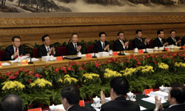 10月17日,中國共產(chǎn)黨第十七次全國代表大會主席團(tuán)在北京人民大會堂舉行第二次會議。胡錦濤、吳邦國、溫家寶、賈慶林、曾慶紅、吳官正、李長春、羅干等出席會議。 新華社記者:蘭紅光