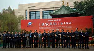 11月9日,代表在《西安共識(shí)》簽字儀式上。 當(dāng)日,為期兩天的2007歐亞經(jīng)濟(jì)論壇在西安落下帷幕,參加此次論壇的政府代表和組織代表達(dá)成《西安共識(shí)》。 新華社記者