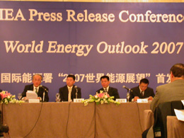 《世界能源展望2007》中國(guó)首發(fā)式現(xiàn)場(chǎng)。 | “中國(guó)有可能給世界帶來(lái)前所未有的能源機(jī)遇,參與全球治理已成為中國(guó)能源戰(zhàn)略的必然選擇。”清華大學(xué)國(guó)情研究中心主任胡鞍鋼教授說(shuō),“中國(guó)和印度的崛起,不僅改變了世界經(jīng)濟(jì)和貿(mào)易的格局,也改變了世界能源格局,中國(guó)和印度所面臨的能源挑戰(zhàn)也就是全球的挑戰(zhàn)! 胡鞍鋼教授是在11月9日國(guó)際能源署(IEA)舉行的《世界能源展望2007》中國(guó)首發(fā)式上做上述表示的。