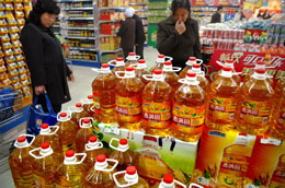 顧客正在銀川一家超市內(nèi)挑選食用油。目前受原料價(jià)格上漲因素影響,銀川市場各種品牌的食用油零售價(jià)格全線上浮,5升標(biāo)準(zhǔn)桶裝較一月前平均漲5至10元。新華社記者:李紫恒