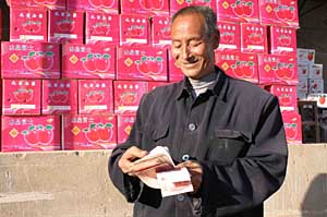 | 陜西洛川縣槐柏鎮(zhèn)度谷村果農(nóng)清點(diǎn)領(lǐng)到的保險(xiǎn)賠款。新華社記者 張軍
