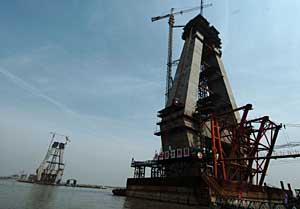 | 建設(shè)中的武漢天興洲長(zhǎng)江公鐵兩用橋。本報(bào)記者 程敏