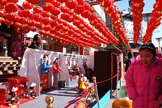 | 日前,一名女孩正在塘沽街頭觀看商店門前布置的景觀。天津市塘沽區(qū)街頭到處洋溢著節(jié)日的喜慶氣氛。新華社發(fā)(扈明
