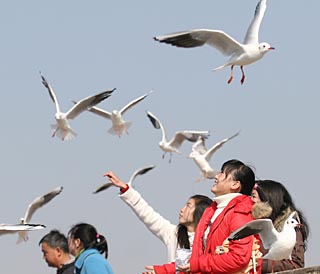 | 昆明市市民來到滇池邊喂食紅嘴鷗。新華社記者 鄒崢
