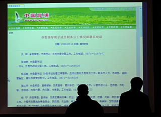 | 昆明市民在電子屏幕前觀看有關(guān)部門負(fù)責(zé)人的聯(lián)系方式。秦晴
