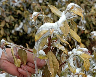 | 安徽大別山暴雪重災區(qū)岳西縣,茶葉上覆有數(shù)厘米厚的冰層。新華社記者 程士華