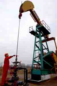大慶油田第六采油廠的技術(shù)人員對抽油機(jī)進(jìn)行巡檢。新華社記者:陳建力