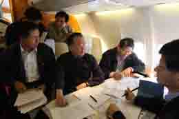 北京時間5月12日14時28分,四川汶川縣發(fā)生7.8級地震,中共中央政治局常委、國務(wù)院總理溫家寶趕往地震災(zāi)區(qū),指揮抗震救災(zāi)工作。這是溫家寶在專機上研究布置抗震救災(zāi)工作。新華社記者:姚大偉