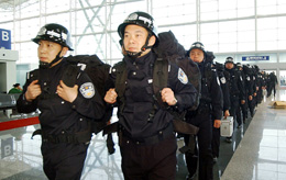5月13日中午12點,200名天津特警及兩名隨隊醫(yī)生攜帶照明、破拆和通訊工具,飛赴四川重災區(qū),開展搶險救援工作。